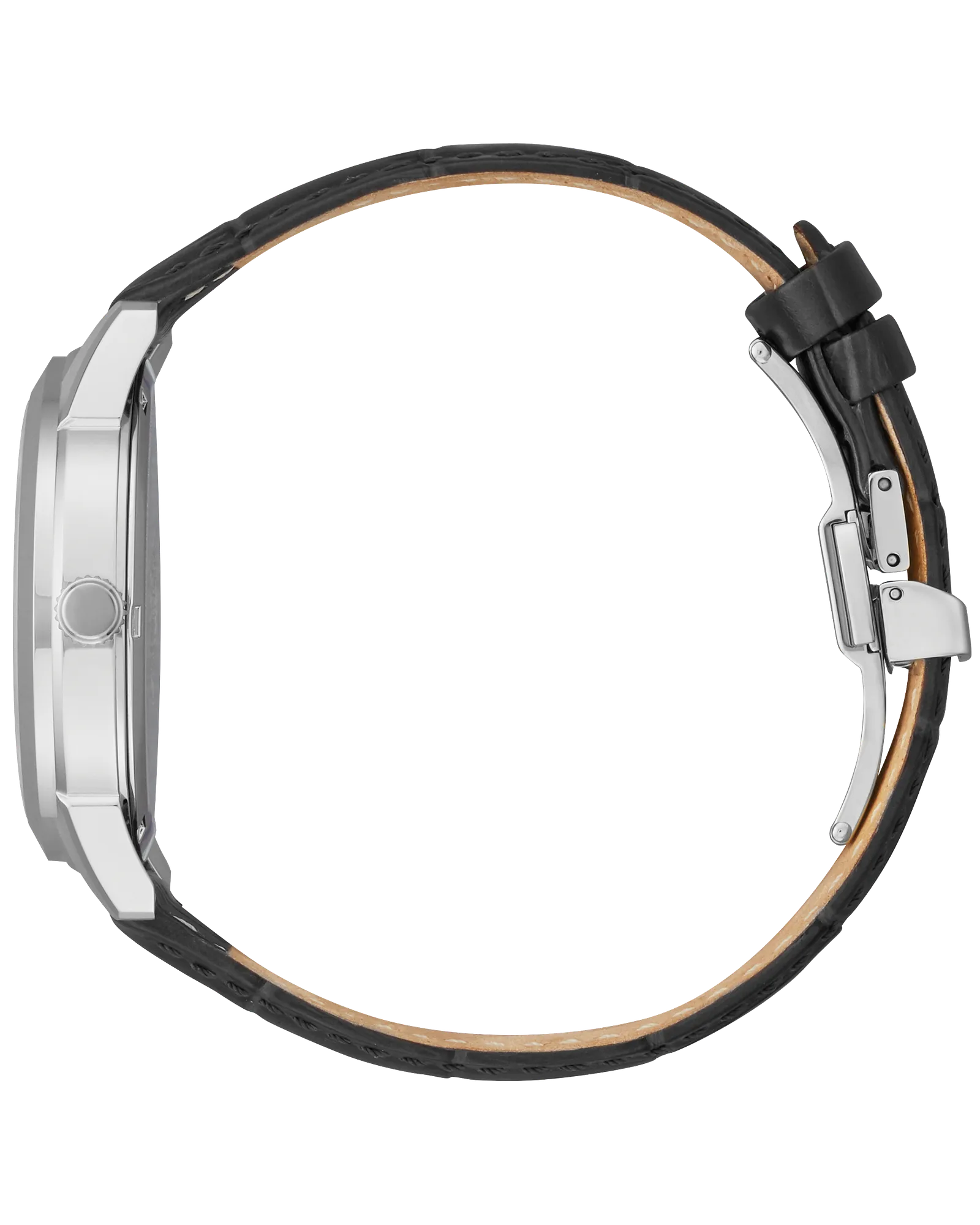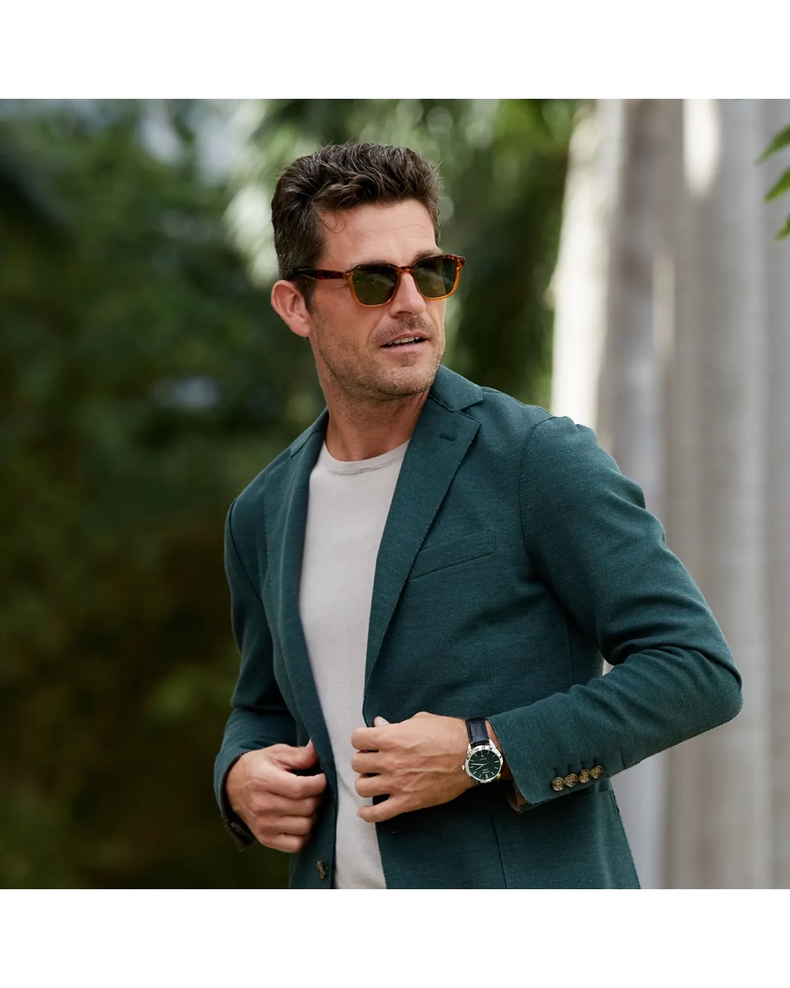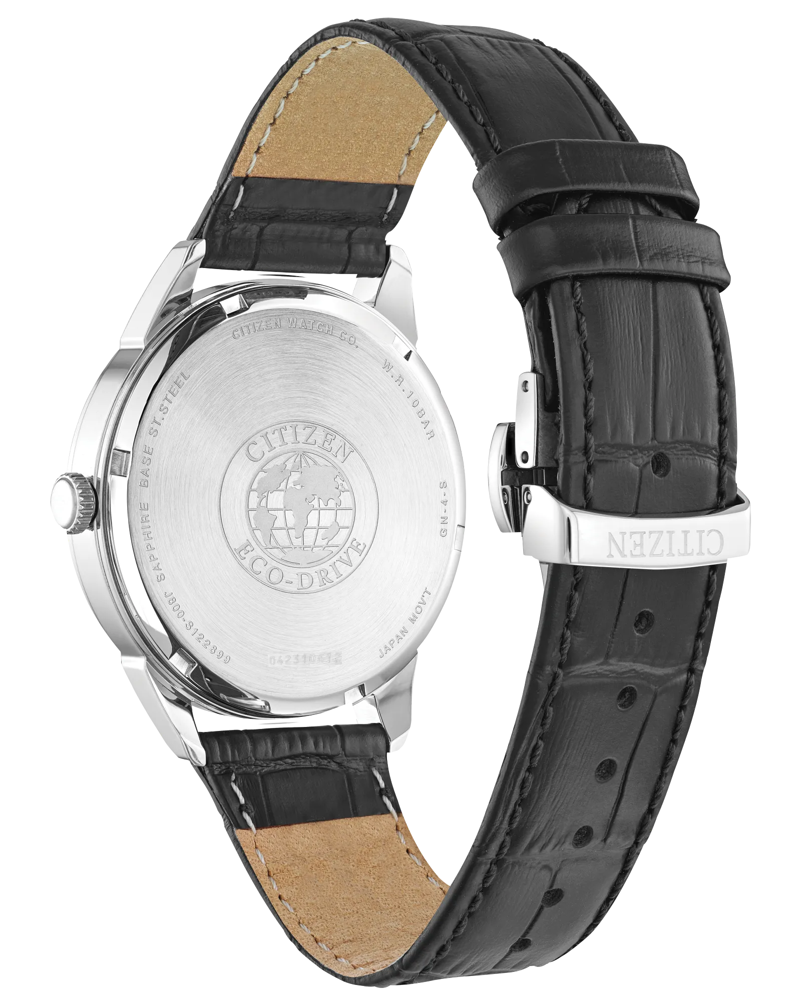 Citizen Eco-Drive Corso featuring a green dial with day-date display, stainless steel case, and leather strap. Sapphire crystal and water resistant to 100 meters. Powered by light with Eco-Drive technology. Made in Japan. Includes 5-year limited warranty.