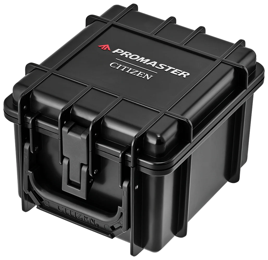 Citizen Eco-Drive Promaster Diver featuring a black dial, 200M water resistance, stainless steel case, and 3-hand date function. Powered by light with Eco-Drive technology. Mineral crystal. Made in Japan. Includes 5-year limited warranty.